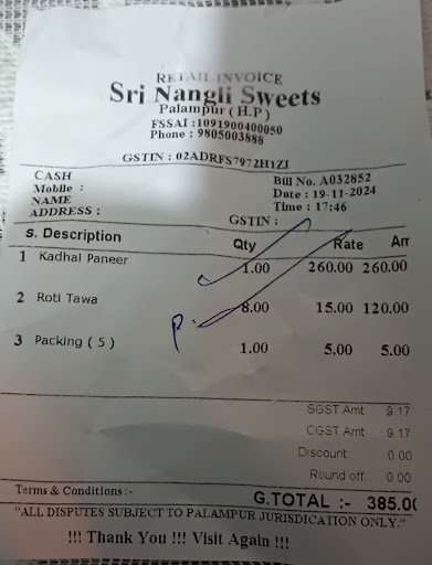 Sri Nangli Sweets, located opposite Sabzi Mandi on Baijnath Road in Palampur, is a vegetarian eatery and sweet shop known for offering a wide variety of organic sweets, North and South Indian snacks, and breakfast items in a cozy, clean setting. It holds a solid average rating around 4.3/5 across review platforms.