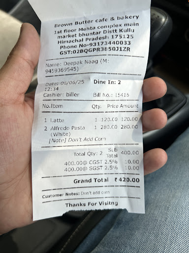 Read moreSince i live in bhuntar. I always wanted a restaurant/ bakery near me , where i can reach in 5 minutes or they can delivered me food in limited time span. But my main concern was not the time it has to be about the quality and taste. As there are not much of good option for restaurants and especially bakery here and if there are some they don’t provide the that level of quality + taste in their food. But in Brown Butter I think i had almost tried everything in vegetarian part of menu and most all of the dishes are too well cooked and tasty. But that is not the only thing i tried. My favourite is blueberry cheese cake which is sooo soo good Yaaro kya hi bolun. And their freshly made cakes & brownies is so good that it reminds of some bakery where i used to go in GK 2 in Delhi . And i was surprised by the quality of product there are using to made those items. I never thought in my life that i would get to eat something like this in my hometown which i mostly get in cities. But hats off to Miss Chandni & my good friend Vishesh Who had done a job really well. And i feel so happy that in bhuntar at-least there is one place where i can recommend someone to go and try their food and bakery items. I wish them all the best for future and many more orders from my side. P.s - Don’t forget to try their pizza with freshly...