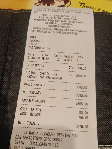 Read moreWent there and now regretting. Been to so many barbeque restraunts across India and this is the wirst one ever. Lets starts from Aprin/Cloth Napkin they give, its having holes in it. Then the service, no one there to clean your plates or ask for food. We waited long enough for our food and first time ever, I started with SALADS just because I was hungry in a barbecue restaurants when you pay 1000 rs for one person. Food got delayed, but from my earlier experiences with AB's we thought it must be worth, but when they started to serve the items, like chicken, prawns and fish, all were cooked with same utterly bad marinations. We asked the waiter to change the marination, and after when we started to eat the desert, they came with 2 sticks of Prawns with changed marination. Horrible. We ordered drink on our own just to eat all the food that came to us and fill our stomach. Afterall we paid so highly for bad food. Desert were also pathetic. Will post pics of half cooked Jalebi, that we got even when we complained and asked to cook again. Gulabjamun were out of fridge and where in hot box for no reason. Seems like they had left over food from 31st night that they wanted to get over on 1st. They were overconfident because of all full bookings. Another huge issue, when asked for lemon, they were not able to give even lemon, which we can try to correct the taste of food. Live counters are too small. No one at ice cream counter. Not all dishes in menu were served, like matan kabab was not even came once to us. Pineapple were too sour to eat. Guy who is serving, when asked to serve prawns, unnecessarily put chicken and fish into our barbeque table. Asked to remove immediately, otherwise he was not even bothered what we wanted. We called manager at last and told the feedback, he too was clueless and was not able to do anything. I asked bill immediately, paid the dinner for all of us and came back. After coming home, I got call from there Manager and he was requesting to visit again. I doubt that I am that much stupid to waste money and do the same mistakes again. You need to ask for ice cream, else you will not know that it exists apart from anywhere in menu....