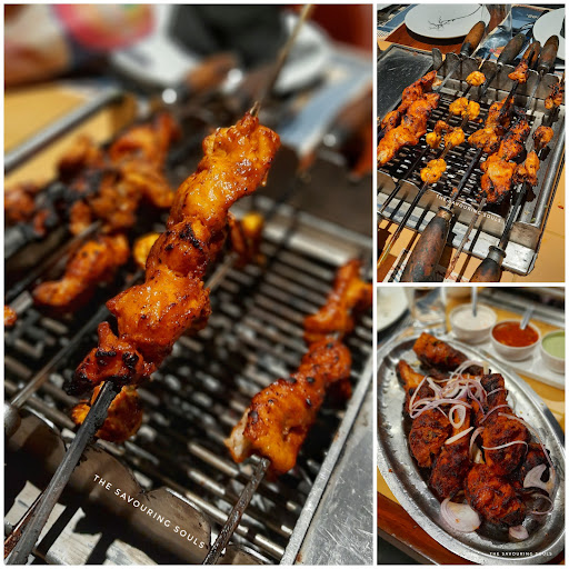 Starters: Crispy corn chaat, roasted pepper dumpling soup, and lasuni methi paneer.¹ Main Course: A range of options like biryani, curry, Chinese, continental, dal, and rice.² Live Grill: You can also grill your own skewers right at your table, with options like bamboo shoots, zucchini, paneer, and mushrooms. Desserts: Apricot cheese cake and mango pudding are highly recommended.