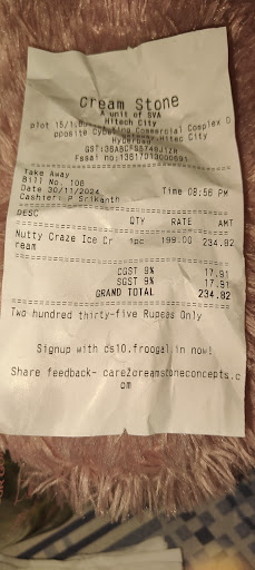 The service at Cream Stone is generally commendable. The staff are friendly, efficient, and skilled in creating the perfect mix of ingredients. They are also accommodating, willing to cater to specific dietary preferences and allergy considerations.