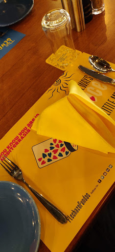 I loved the funny quotes and illustrations on their wall...those were quirky and catchy...the restaurant follows the color scheme of yellow and blue...and the modern decorative lamps they use were setting the mood...even the food stalls had unique names and nicely decorated...they have long seats in a row where around 20 people can sit all at once..also one of the corners have glasses instead of solid wall and thus it is a great pleasure to gaze upon the highway while enjoying a meal..