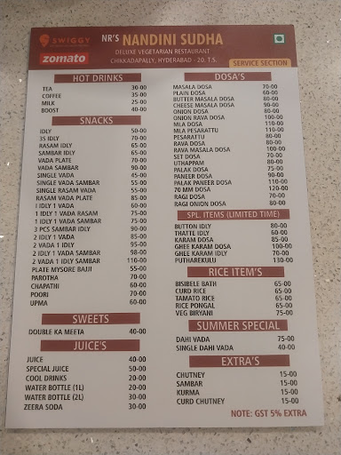 Rates are high, but quality of food served is low. Merely respect their customers and any request made for adding extra chutney is rejected outrightly. The staff is very rude in their behaviour. They say that they are from Karnataka, and do not live up to their reputation of friendly people. Otherwise, Cannadigas are very cordial people. The earlier management used to be very nice and the food used to be tasty. After the name changed to Nandini, all the glory and good will diminished. If the management do not take note of these points and improve their customer service and food quality, then they will never be able to win the confidence of a customer. Overall, very poor and very bad on the part of the management of Sudha Nandini Hotel. They are not even close to the name that Sudha Hotel had built over several years and stood out as a landmark in Chikkadpally area. Deeply saddened and disappointed at the same time with the state of affairs currently operating...
