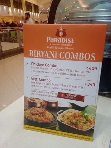 Read moreI have been to paradise resturant many times....but this one in particular gave me a very bad experience...I was to a movie and on my way out around 10 -10.30PM I picked up a parcel of chicken biryani (it costed more than usual as its in a mall...which is expected). My kid insisted he would like to have it there in the mall itself , so when I opened there was no chicken in it. When I went back to the counter there were two more girls complaining the same. The staff was of no help...they should have informed the same instead of packing/serving just masala rice. I can't really say how the service would be normally but if have food after hours from this place just be clear before placing order. I...