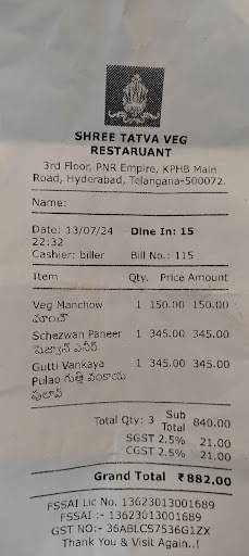 Staff: The staff at Shree Tatva truly goes above and beyond. Each member of the team appeared well-trained and worked seamlessly together, creating a smooth and pleasant dining experience. They were courteous and professional, handling even the busiest times with grace and efficiency.