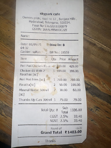 Read moreSkyPark, A hidden gem in the lanes of Banjara Hills, Rd no. 12. which is one of the oldest Rooftop Cafe in town. This Cafe is very well known for their food, live screenings and live music on every sunday.! Well i must say your sunday is sorted.! Located on the top most floor, you can enjoy your food with a mesmerizing view of the city. They have both indoor and Outdoor Seating option avaliable. Indoor seating with minimal seating option. Where as the rooftop seating is having an ample space for dining. I kind of regret how i wasn't aware of this place till date. Well as now i know this gem, this is surely gonna be my go to spot for some lipsmacking food they serve here. The staff is very corteous too. The one thing that i actually loved about this place is the food they serve here and also its affordable. Lets talk about food now.! Lamb Mafia Pizza - Thin Crust Pizza topped up with capsicum, olives, tomatoes and loads of Mutton chunks and Cheese. This has become my absolute favv. Chicken Salami Pizza - Thin crust Pizza topped up with olives, chicken salami, onions and loads of cheese. Sprinkled over a bit of oregano and Chilli Flakes. This was an absolute treat. Butter Garlic Prawns - If you're a sucker for prawns this is for you. The super yummy texture mixed up with Capsicum, in house Sauces and green chillies. These will keep you wanting for more. Chilli Prawns - Prawns tossed up with onions, chilli sauce, capsicum, and spring onions. These had a slightly spicy texture when compared to the butter garlic prawns. Pepper Chicken - Chicken Chunks marinated with their in house ingredients and deep fried. A simple yet delicious dish. Cajon Fried Chicken Salad - Crispy Fried Chicken with boiled eggs, jalapenos, olives, lettuce and Cherry tomatoes. This had a bit of tangy pickle flavour. Chicken Steak Sizzler - Chicken Steak Served with herb Rice, boiled veggies and french fries. The chicken was cooked to perfection Lamb Steak With Rice - Mutton was delicious and Tender. This continental dish had a slight Indian Touch to it. Was served along with herb Rice, boiled veggies, fries and garlic bread. Skypark Cafe Baked Lasagna - This rich baked Lasagna is a treat for all meat lovers. The aroma of this and the lasagna is fully packed with delicious flavours. I wans't expecting it to be this good. We also had some refreshing Mocktails and Thickshake. Mocktail's. Cranberry mojito. Litchee Delight. Fresh Lime Soda. Thickshake. Chocolate Overload. Well, i had a great time here. If you're in or around Banjara Hills. Make sure you try this place out. I hope this was...