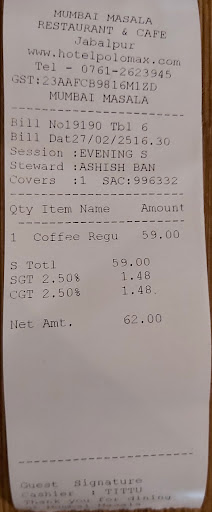 Recently had been to this restaurant Mumbai Masala, located at Jabalpur Railway Station. The moment I sat there the lady on the cash counter asked for the order and told me you cannot sit without placing the order. Though that was bit rude I ordered a coffee.