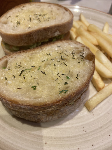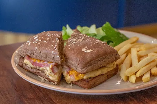A Simple Pecan Brown Bacon Cheese Sandwich With Hints Of Potato Is All You Need To Fulfil Your Cravings. This Was My First Time Trying Potatoes In A Sandwich And Believe Me When I Say That This Combination Is Insane. The Soft Mushy Potatoes Go Very Well With Crispy Grilled Bacon. Soft Buttery Bread Loaded With A Generous Amount Of Cheese, Perfectly Seasoned With Herbs And A Mashed Potato Filling, Crispy And Buttery Grilled Pork Bacon Strips And A Good Combination Sauce, This Sandwich Was Definitely Exceptional. It Was Beautifully Plated On A Minimalistic White Plate With Crispy Potato Fries And Seasoned Lettuce Salad As Siders.