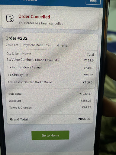 We have placed an order for our guests and were waiting for the same. After almost half an hour we made a call to delivery guy. And for our surprise delivery guy was not carrying the The number which was shown over the app then we tried calling him on the same number I have collected the number from his relative after about 15 minutes he has arrived and then he was asking us for extra money which was almost hundred bucks over and above to the bill which was generated by the app then we have objected by he’s asking us for the extra money and he said that this is what we need to pay otherwise he would not deliver the order then we have asked him to connect us with his senior he has connected us with a girl sitting there in the department and that girl has asked him that if we are not paying him the extra money he should take the order back. Being an aware customer of India we have decided not to take the order as he was asking us for them he was asking us for more amount then the generator invoice then we have made a call to customer care and check what is the actual amount of invoice he has told us that amount was the same one which we were supposed to pay then we have made this complaint to them that why he was asking us for the extra money then they were clueless about it. In total after almost about 1 1/2 hours they have asked us that we can take the order back but we were not ready to take that order because it’s been almost like 1 1/2 hour and a pizza was not in a good condition and we have decided not to take it because we have ordered it for our guests and that’s how we have ended up being disappointed with Dominos. No resolution no customer commitment highly...