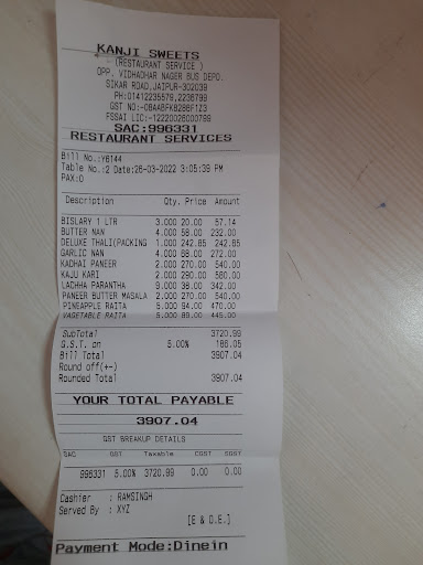 Premium Quality of food with a lot of variety of best quality sweet desserts, bakery products, Namkeen, beverages, south indian food or fast foods. Hotel facility also available for stay at Kanji palace hotel and it is situated at sikar road jaipur. Restaurant facility with multicuisine food And fast food also available. Cafeteria lounge also available. Best choice of restaurant for family,friends and relatives. Also accepts payments via online like paytm,phonepe,Googlepay and UPI etc. Also provides parking facility. Great...