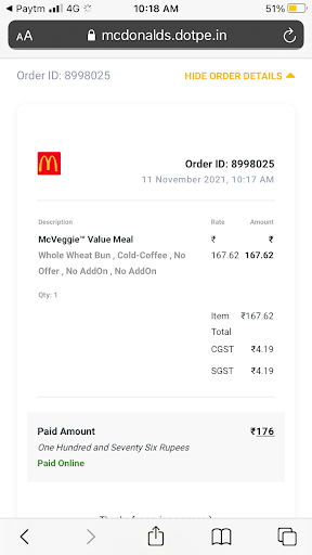 I was looking forward to enjoying my favorite burger, and this experience was a major letdown. I had paid for a complete burger, and the absence of the Aloo Tikki patty, onions, and sufficient sauce felt like a blatant breach of trust.