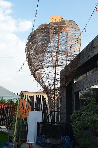 As we open the doors to India’s Only Aviation themed cafe, and seat ourselves, what we see is a very eccentric ambiance that celebrates the art of flying machines. Our table had momento models of the Wright brothers aircraft, while the designs of cushions and cutlery speaks of aero-science and its history. White wrought-iron cycle placed inside with beautiful flowers in its basket just balanced the aero-act. From a hot-air balloon basket in one corner, hanger lights, sturdy metal chains to hold the furniture in place to the chance of dining in raised mid-air swing style, everything about the ambiance of the cafe spells exclusivity.