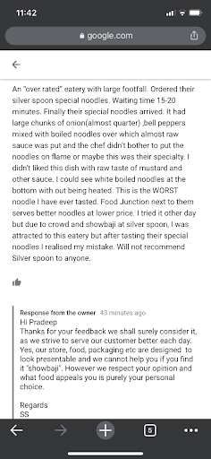Ordered their silver spoon special noodles. Waiting time 15-20 minutes. Finally their special noodles arrived. It had large chunks of onion(almost quarter) ,bell peppers mixed with boiled noodles over which almost raw sauce was put and the chef didnāt bother to put the noodles on flame or maybe this was their specialty. I didnāt liked this dish with raw taste of mustard and other sauce. I could see white boiled noodles at the bottom with out being heated.