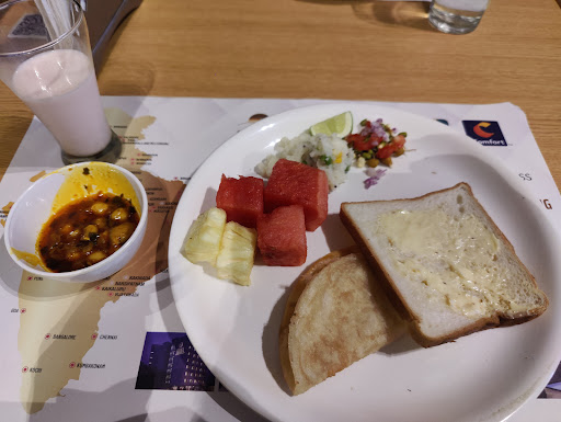 The buffet breakfast had a good spread. There were continental, Indian (including south indian options). There were fruits and salads. A desert option was missing from the menu. The spread was strictly vegetarian. One can also order for dosa and coffee within the buffet. The service was prompt. Few things were used up rather fast while replenishment was bit slow.