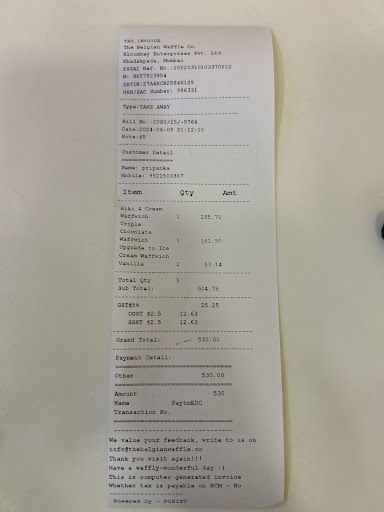 Read moreScanner was not working for payment in between billing counter made mistake in my order. I requested for 1 Kiki and cream and 1 triple chocolate but purposely they made 2 pieces of Kiki and cream. As billing was done on 21:12PM and I acknowledged the mistake in billing by 21:18PM and requested to change the order but they are not at all customer friendly and denying to correct the order…. The worst experience I have with Belgian waffle till date though I am customer of this particular brand since last 3 years but this is the first time experience I have. As attached in picture you can’t see what has been entered by cashier as screen is not visible to us.. such a pathetic...