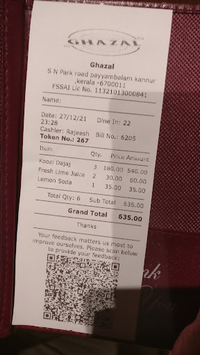 Read moreI traveled all the way from Chokli to Kannur full of excitement for a pleasant dining experience at Ghazal Restaurant, but what I encountered left me feeling utterly angry and deeply betrayed. From the moment I arrived, I was met with intrusive and overbearing service as a waitress forcefully pushed a ₹3,200 platter on us, leaving no room to explore the menu at our own pace. She made occasional jabs about our budget in an unprofessional and insulting manner, and to add insult to injury she compelled us to vote for the restaurant online before our food even arrived, promising a 5% discount that never materialized. I ended up spending ₹2,500 on food that was a complete letdown. The Al Fahm was a tasteless, lifeless mess that failed to deliver any of the promised spice or flavor, even though the waitress had insisted that the dish was too spicy. The Paal Porotta was another disaster; it was not tasty at all and the porotta served with the Alfahm felt like nothing more than a frozen piece that had been carelessly reheated instead of freshly made. To make matters even more frustrating, we ordered beef paalkappa. We were told that there was no beef paalkappa available and that they would provide chicken instead. However, when the order arrived it turned out to be beef after all, but in a much smaller portion that felt like a mere adjustment rather than a proper serving. The only dish that managed to salvage any semblance of quality was the Palkappa, which was the sole bright spot in an otherwise dismal meal. The entire experience was further ruined by the appalling attitude of the staff. The waitress’s aggressive pushiness left me fuming, and the cashier did not even bother to apologize, giving us a rough, dismissive look and treating us like just another option with absolutely zero regard for customer service. I not only wasted my money but also bore the extra cost of petrol for the long journey, and I left feeling completely devalued and disrespected as a customer. This was not just a bad meal; it was a stark reminder of how some establishments prioritize profit over genuine care and respect for their patrons. Until Ghazal Restaurant completely overhauls its customer service and learns to treat its guests with the decency and respect they deserve, I cannot in good conscience recommend...