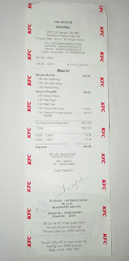 Read moreI recently visited KFC in Kanpur, and overall, it was a satisfying experience. The food quality was consistent with what I've come to expect from KFC – the fried chicken was crispy and flavorful, and the variety of sauces and sides complemented the meal well.