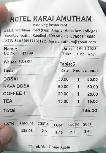 Karai Amutham is a well-known vegetarian restaurant located in Karaikal, offering a simple yet welcoming atmosphere. The place is clean and functional, with a no-frills setting typical of local eateries. It’s a great spot for a casual meal with family or friends.