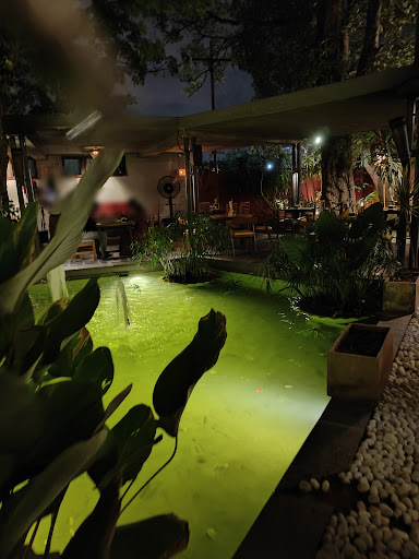The garden seating area is lush with greenery, making it feel like a refreshing escape from the hustle and bustle of the city. The different seating levels cater to various preferences, whether you're looking for a more private spot or a lively table near the pond. The indoor area is equally charming, with its own share of green spaces and a comfortable setting that complements the outdoor vibe.
