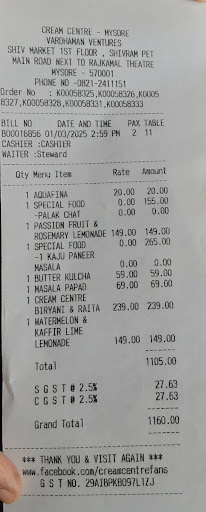 Read moreIt’s a newly opened restaurant I Namma Mysuru. Had high expectations as it had gained quite good reviews and ratings, but okay it’s good. Visited this restaurant with my family for lunch we were like 7 members so booked the table early but it was still empty not that crowded as I had expected. No word about the ambiance it’s very Pinteresty!! With some new decent new style walls. They serve was very very late, even though there were not enough people in the entire place. We literally waited like 30 to 40 min. Food was good but I never say everything was up to the mark. Had huge expectations the presentation was good but the taste was normal not that extraordinary kind. Must try their mocktails which was vibrant and tasty. Rotis, butter naan, garlic naan were all good but please don’t try their cheese parata!! Not nice (not enough filling) Their curry was good and biriyanis was also okay. But it’s really a nice place to go dine with family and friends who prefer only vegetarian food Coming to parking, they have a underground parking which wil be free for only cream centre guests as they give a free parking card ( if u have two cars with many guests ask for another card) Okay… it’s a Good place in mysuru.