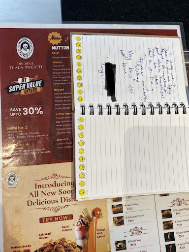 Read moreI have always been a lover of thalappakkatti chicken biriyani..But today I had the worst experience at the restaurant.first we ordered moru moru basa fish.They brought moru moru prawns and we said we ordered basa,not prawns.They said it was by mistake.Then we Ordered thalapakkatti chicken biriyani.They brought me the biriyani after sometime.At first sight itself,I understood that it was not the thalappakkatti biriyani that I always used to eat.The chicken pieces were taken from some tandoori chicken curry or something .It tasted like that.I complained the same that this is not Thalappakkatti biriyani and waiter said he will check with chef..He came back with a katori with one piece of briyani chicken in it and told me that the thalappakkatti chicken piece is over and thats why chef managed with this.Well,Is that a reason.By 1.30,your authentic dish is over that too in a not so crowded restaurant.There were only 3 families there at that time including us to remember.If that is over also,they should have the responsibility to inform us that chicken biriyani is over and you can try something else. I felt like,they tried to cheat us with some chicken pieces from some other curry.Dont try to fool people.And finally they gave us a lime juices to compensate all these drama..Will never go...