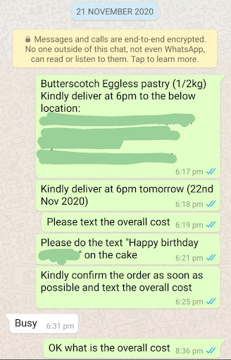 Worst service ever.. Gave an order for a butterscotch cake a day before a family member's birthday, the person who took the order didn't post the overall cost of the cake despite me asking three times. If he had directly said that they couldn't take the order, there wouldn't be any confusion and I could've looked elsewhere to place the order. But this guy kept leaving me on read and didn't pick up my call. I've even attached the screenshots for reference. When I then called the next day to ask about the cake, the guy actually had the audacity to tell me that they didn't confirm my order! If it was so, couldn't you clearly type it out? Why was the employee constantly leaving me on read despite me asking about the order three times!? WORST SERVICE EVER. NEVER GOING TO ORDER ANYTHING FROM THIS STORE. GET YOUR EMPLOYEES TO COMMUNICATE BETTER, DOLPHINS. YOU CLEARLY DON'T DESERVE...