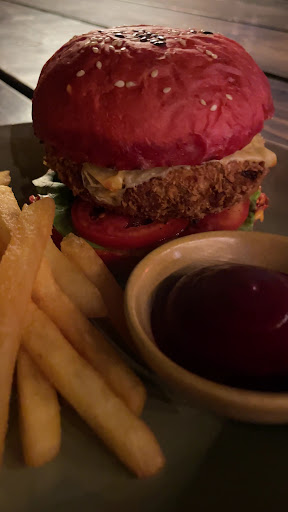The Soy Mushroom burger was beautiful, red buns, courtesy beets used for colouring, crispy patty, that had a very grainy soy and mushroom mix, with mild Italian flavours, at least that’s what I got, the Thecha here too was mild and didn’t overpower the meal, absolutely fabulous was the beet connection in the sauce, earthy, slightly sweet, Beetroot ketchup was just what was needed to elevate this vegetarian burger.