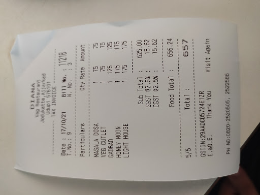 We ordered for the the following things : Cutlet : was good. Puri & paneer butter masala : poori was oily, curry was too sweet. Puri & kurma : poori was oily and kurma was very sweet too. Not taste. Gulla podi : it was around 7 to 8 pieces per plate. But we had to find the vegetable inside the besan coating. It was chopped so thin that i dint feel i ate gulla podi at all Nendrabale podi : was ok....better than gulla podi. Gudbad : we thought atleast this was good. But it was worst too. Pista and strawberry ice creams were present. The quality and taste of ice cream was too low. For that price the gudbad was tasting bad. Bonda milkshake : this was good. Cheese sandwich : this was one of the worst sandwich i had. They charged us Rs.110 for it but the sandwich was not grilled too. Just 2 pieces of bread with sides removed and one slice of amul cheese placed in between. I need not come to Diana to eat this rather can make this at my hotel room without flame. After requesting to toast it, they agreed to toast the sandwich and also told us it will take a lot of time, which was disheartening.
