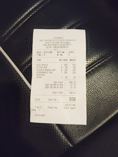 Isiri shimoga - They didn't bother to service us. The order was taken very very late, the food was served muuuuuch later, ordered Chicken65, what got served was far from it. Didn't taste good either. Pot Biryani was average. The saddest part was water was not served. Even after repeated asking for warm water, got room temp water, later after another stint of a long wait got terribly hot water. The lack of interest in service was palpable. All this was not due to any peak time rush. It was around 5pm that we went in when there were very few customers. Will not...