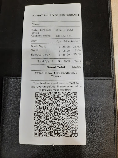 Kamat hotels never stops to delight us. The place was really clean and tidy the staff was very welcoming and the food was just delicious. The menu breakfast dishes and also has south indian and north indian thalis, soup, fast food snacks like noodles, Gobi, etc etc various dishes from Kolhapuri, panner, mix veg, mushroom, cashew, and tandoori roti, naan. Chapati use, puri with rice items white rice, fried, curd, jeera, veg biriyani etc etc and sweets such as jamoon.the prices are also reasonable like in any Kamat restaurant We really had a delicious meal in the afternoon.