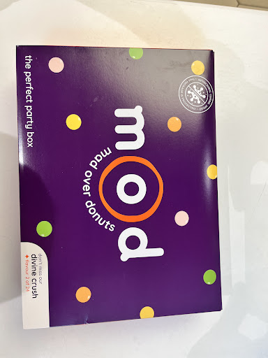Contemporary outlet of a chain donut bakery selling instore & delivering boxes to customers' doors.