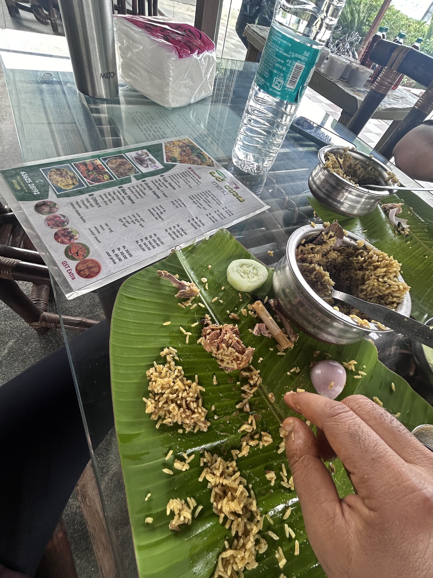 Donne Biryani:Ā Classic Nati-style biryani served in a leaf bowlāfragrant, spicy, and packed with tender pieces of meat.