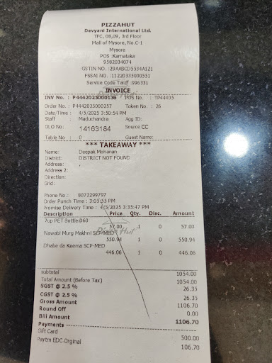 Β Β Β Read morePathetic service by the caretakers. I was told service would start at 11am which I agreed and respected the decision. However what followed was disappointing, the 1st pizza was delivered after 25 mins and later garlic bread was handed over after another 20mins. We were told 12mins delivery and made to wait. The person was busy talking to her colleagues and not bothered about the delivery. When I inquired why are you not able to deliver on time the response was only a sorry. Since I had come to visit mysore for a day trip did not argue and left disappointed. Super expensive and not worth the taste which was ordinarily prepared. Avoid pizza hut and go for domino's
