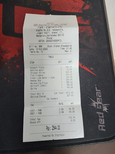 Read moreLet me start with Parking, security was helpful in parking the vehicle at right place and correct position, since it was raining he made sure we are covered under umbrella from car to entrance. As soon as we entered people whom were sitting outside open sky area were standing inside as there was not much space under the covered area. We waited about 15 minutes, rain water was dripping from the ceiling in couple of places, got the table arranged inside. Ordered starters and drinks it was good and staff's were prompt and courteous, felt nice so went ahead and ordered Pizza which is their main course items(Pizza and Burger). Ordered couple of Pizza one in Veg and Non Veg each plus Lime soda Sweet n Salt, got them on table within 10 mins but regretted while eating the 1st bite and thought came both the Pizzas are wasted, base was crunchy and toppings were not upto the mark it was all cheese, entire mood was spoiled. Lime soda was too salty. Gave on spot feedback. Cost is on higher side and...