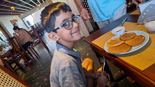 We had a package of breakfast and lunch/dinner in Sterling Karwar. First day dinner had multiple veg and 3 non veg options in buffet. Breakfast was mostly veg and choice of eggs. Overall food was okay, but lacked a bit in variety and taste was average. Dinner time Red Thai curry chicken was bland. Could feel that the chicken was chewy. Honey coated chilly chicken was better but lacked consistency, many pieces seemed bland due to the lack of sufficient sauce. Home style chicken was fine. Paneer pagoda was bland, cold. Tandoori roti was fine. Breakfast Upma was good. Dosa can be much better. Medu vada was very oily. Chole Batura was decent. Watermelon juice was very watery. The second dinner had a couple of fish items. Instead of white rice there was fried rice and Chinese style gravy chicken. Overall this was not bad. Desserts were served at the table. Chef was at the tables asking about the food. The veg soup was also pretty good. The second day we avoided the dosa. Kid liked the veg sandwiches and pancakes. The medu vada was much better. Service was very good overall. Service staff provided food at the table as requested. Anguri even went further and gave us honey for the kids pancakes.
