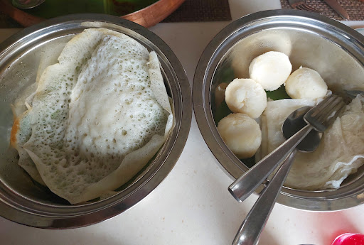 The menu is extensive. It covers even popular North Indian/tandoori dishes as well as popular Chinese ones, but since we wanted to sample local dishes, we chose a crab karavali curry; an anjal polichathu (fish smeared with a masala and steamed in a banana leaf package) along with bendakkai sole (okra with lots of grated coconut and kokum) and neer dosa. As a complimentary starter, we were given a basket of addictive fried crackers, and a selection of four different chutneys and pickles (including an unusual one for me, made from back grapes: delicious).