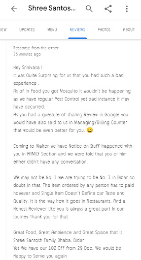 Read moreIt's now also quite surprising, you are still ignoring this seriousness of the issue by giving a big write-up. If I would have informed you at billing counter, what difference it would have made, same thing.. its a grave sin..you still did not get the issue/thing right.. you are not showing any guilt, rather than boasting about yourself (Great good,great ambiance and great space, blah blah blah..) and bribing us by giving 10% discount... I'm still doubting which are the adventurous people who are going to come on 29th by falling for your discount prank.. "A wrong is wrong, you can't be right by doing wrong"... And ohhhhhh please do not even dream of becoming no 1, it will be nightmare for...