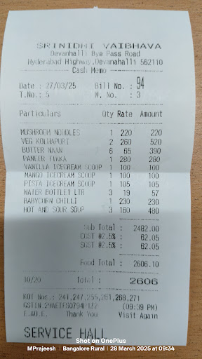 Whether you're a South Indian food enthusiast or a newcomer to the cuisine, Srinidhi Vaibhava is a culinary gem that offers an unforgettable journey through the flavors of the region. It's a place where you can savor the time-honored recipes of South India in a comfortable and welcoming setting.