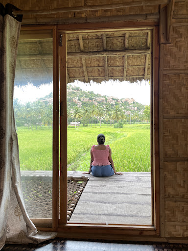 Small hikes to the private sunset point Walking in the paddy fields Getting couple massages The stay is the heart of North Hampi, so all the nearest attractions like Anjanadri hill, Ranganata swamy temple, Vali caves, Pampasarovar, Sabari Caves and Chintamani Temple complex can be covered with the easy availability of bike rentals and transportation facilities by the locals ( Pawan and Hemanth), Swimming in a private point in Sanapur falls (when the water flow in moderate) Coracle ride (with the rover Shinu) and sunset experience at Sanapur Lake Cliff jumping with life jacket 🦺 Purchasing handmade products made with Banana Fibre by the local women. Bird watching and photography 📷