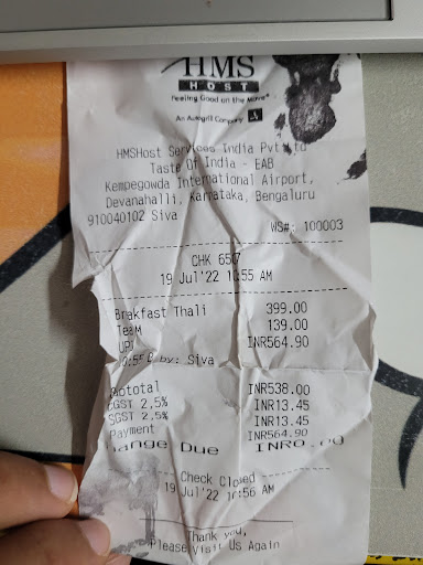 Read moreI strongly not recommend this place for food reason is not the taste of food but the dangerous part is the hygiene. I was there today at taste of India in Bangalore airport for lunch but when I was about to receive my food in plate I just thought of wiping the plate with tissue and suddenly I see that the entire plate was not washed . I told the serving guy who but he refused to agree and then I picked different plate and which ever plate I picked all were not washed and left with lot of oil and stains. I was upset and informed other customers and all agreed with the points. I strongly feel the food inspectors should do this exercise in regular intervals. PL act strongly about this issue. I feel airport authority should act and cancel there licence. Appeal to all the customers to check the cleanliness of plates before you...