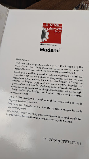 Read moreThe Bridge Restaurant is the restaurant of the Clarks Inn hotel and just about the only fine dining option in Badami. The interior is very up western style and certainly looks more upmarket. When I can in for lunch I was just about the only person in the restaurant and obviously had no trouble getting the waiter’s attention.