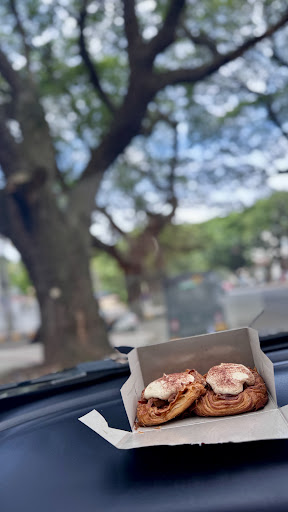 Enjoyed the pastry right in the car, parked under a canopy of trees — a slice of peaceful Mysore life.