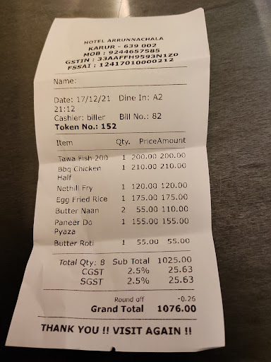 Read moreWhat was meant to be a quick lunch stop turned out to be surprise discovery. Only a brief detour off Salem - Madurai highway, Arunachala is a great option for lunch/dinner stops if you're travelling between Bangalore and Madurai. We ordered quite a few items and all the dishes were exceptional. The mutton biryani was made with small grained rice (the kind I like) and was surprisingly delicious. The portion was ample for one person with a good appetite. The starters we had (suka, wings, chicken 65, masala papad) were all awesome too. However, the malai kofta and naan were my favourite. So creamy and so tasty. The payasam served with the meals caught my attention too. We had brownie with ice cream and red velvet with ice cream for dessert which was another surprise. We never expected a restaurant in a small town to have great dessert but what do we know. The brownie was dense and gooey just the way you want it. In all, an amazing...