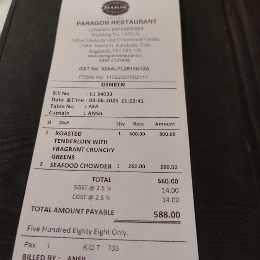 Read moreA Culinary Oasis on NH 544 Conveniently Located on the busy NH 544, PARAGON continues to set the gold standard for dining. I have been a FAN of PARAGON ( Across its’ Branches ) For over a decade — not just to satiate hunger, but to experience the rich culinary heritage of Kerala served with grace and precision. From the moment you enter, cleanliness and hygiene stand out as a hallmark. The dining area is immaculate, the restrooms spotless, and every corner reflects a culture of care that’s increasingly rare. Service is swift and seamless. During my recent visit ( 3rd June 2025 ) , I was warmly welcomed and promptly seated and served my food order. The seafood soup was delightful — brimming with freshness and layered with coastal flavours that awaken the palate. The beef salad was the true star of my meal experience : succulent, tender strips of beef, tossed in a simple vinegar dressing that allowed the meat to shine through. Generously paired with crisp, vegetables, it was both refreshing and hearty — a rare balance. Special mention must go to Mr. Ganesh Kumar, the Restaurant GM , whose personable demeanour and customer-centric approach elevated my dining experience. He clearly demonstrated to me ALL Guests of PARAGON feel valued with his warm smile. Of course, no review of Paragon is complete without praising their Kerala food options. Having been a Loyal Fan for Over a Decade, I can vouch for the consistency and authenticity of their dishes — whether it’s a spicy fish curry, fragrant biryani, or the humble avial. For hungry and discerning travellers, Paragon is a must-stop for both lunch and dinner. They do not just serve meals; they offer moments of comfort, flavour, and care — a rare trio in today’s GREEDY world of Food Service Enterprises that deliver ZERO Value...