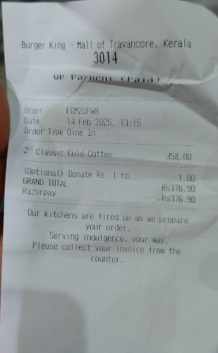 I’ve tried cold coffee from several other brands, and I’ve never experienced anything like this before. When I raised my concerns with the staff, their response was unhelpful and disrespectful. They seemed to imply that I had never had cold coffee before, which added to my frustration. I ended up leaving the coffee at the counter and returning without consuming it. And without my concern they have added donation in oit bill and there is no break up for Rs.18.90 in the bill.