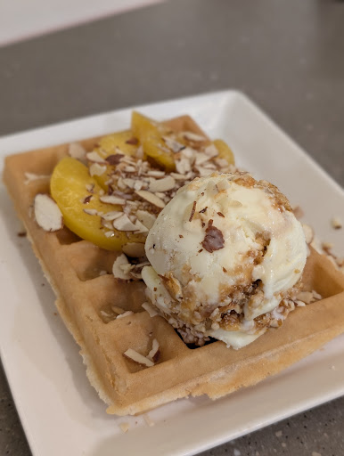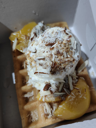 The waffle was the worst I’ve ever had—way too thick, with flat-tasting ice cream. They put exactly four half-cut peaches (probably canned), and the entire thing was just bland. No sweetness, no flavor—just a soggy mess.