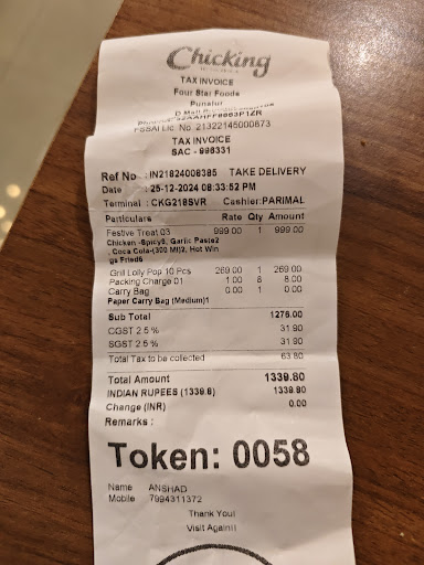 ChicKing in Wisma Mall, Punalur, offers a delightful dining experience with its combination of excellent service and delicious food. From the moment you step in, the welcoming ambiance and attentive staff set the tone for a satisfying meal. The efficient service ensures that orders are taken promptly, and food is served in a timely manner, making it an ideal spot for a quick bite or a leisurely meal with friends and family.