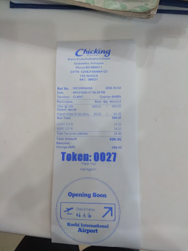 I, with my family visited the ChicKing outlet in MC road Kottayam on 6th March 2020 at about 8 PM. There were no guest in the restaurant at that time. I went to the counter to order the food. One guy, seems to be the in charge(blue color uniform was worn). he was standing behind the billing. When I ask him the order, he just moved out like it was not his job. Then a service boy came there and took my order. The food was served very late compared to other outlets of the same group. Also, i ordered 9 piece chicken bucket. I was given 1 leg, 2 breast, 2 thighs and 4 wings. I am not sure if this is the correct count. Any how, i guess I must be given atleast two legs. I didn't complain about that. Later, after food, i went near the counter again to pay the bill holding my credit card in my hand. The same guy in blue shirt was there pretending that he is doing some tedious task, in reality he was simply standing there. There were no guests near the cash counter at that time. I waited for about 10 mins for this guy to give bill. He didn't do that . When I asked again, he said he didn't understand that I was waiting for bill. And again, he moved away. Another service boy give me the bill. I have also written a review in their card. I hope it will vanish into thin air as soon as we left.