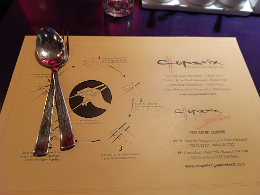 I have been to this restaurant when it had just opened 6 to 7 years back even before their sister concern, Garam Masala has opened. The restaurant ambience has always been nice especially during dinner than lunch, their waiting staff are socially polite but not competent for their role as waiters given the price on the menu, the menu is a mix of Chinese and Thai cuisine but the sad part of m is a typical customer in Kerala would not understand what the names on the menu meant i.e. what they should expect to land on the table as their dish. Now the reason I say this is bcos. What Chicken is known in China, Japan or for that matter Thailand is irrelevant to the Indian customer or what are the herbs, sauces etc. named as in India the Indo Chinese palate is far popular than the Chinese or Thai. Hence if Chopstix is determined to use the names from a foreign land great but they need to have a decent decription of the dish for the local community to avoid wrong order, mis communication of the order/dish which I am sure happens commonly. Today I visited them after a very long gap and to my surprise yet again some more fancy names and our order taker was none other than the owner's friend who has been with them since the inception as I remember him. On enquiring some of the changes on the menu he patiently tried to explain some description of the dish but given that on my last couple of visits to them had not been great for the same reasons of my understanding of what I had ordered and what eventually arrived was different, he wanted to ensure that I am happy I guess. But he had to to disappointed again because the dish he mentioned and I confirmed was one disastrous dish that had the chicken served partially cooked and his explanation to that was Thai dishes are generally cooked like this. I requested him to either cancel or recook the chicken which he did and we were surprised to see the same dish without any visible change whatsoever. The so called individual who I earlier mentioned as the owner's rep stood where he always stands behind the cash counter without moving to check if what he had got done was to our satisfaction. Which I doubt was because he believed that no other customer "his hi fi customers who visit have given him that feedback and he thinks I was the only one to do so". If that was right that is quite ok because I am not too sure if these hifi customers knew what they ordered and had or they don't mind eating partially cooked chicken. Overall his behaviour being rather unprofessional and the quality of the dish was below average yet again. People are different and so are their palates. If he knew I was fussy a good restauranteur would be additionally vigilant and careful when suggesting a dish from the menu. Far eastern cuisines have different cuts of meat and poultry hence they taste different and so do the sauces that the dishes are prepared with. So the best person to know this is the order taker. Either they should explain the dish if it is not described or should have tasted it to be able to give the customer a honest view of the dish. My guess neither of this was done in this case. So my humble opinion to all who visit Chopstix(especially the NOT so Hifi ones) be sure to check more than once on your order as I sincerely hope you don't have to leave the restaurant feeling cheated. The dishes were lying on the table and the spineless chap had no other way than the refrigerator to put his face to while we were leaving as he knew well enough what he would have heard if he asked any opinions. I felt sorry for him as he was not able to do justice with us because of his belief that the dish was made at its best. The customer can have their opinion and feedback but the chefs/ cooks are right in doing what they did...