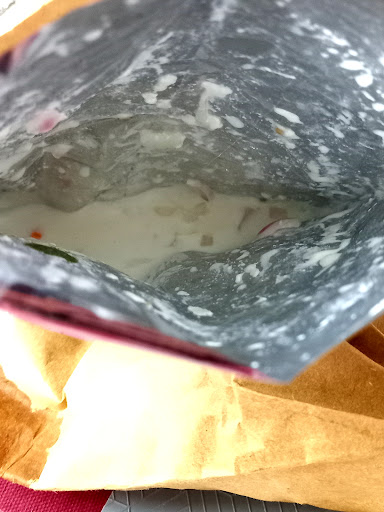 The Chicken biriyani was an average (mild flavour, not that spicy), normal portion size and along with it came a pickle, papad and a Raitha (salad), which wasn't sealed well and spilled all over the paper bag and my dining area.